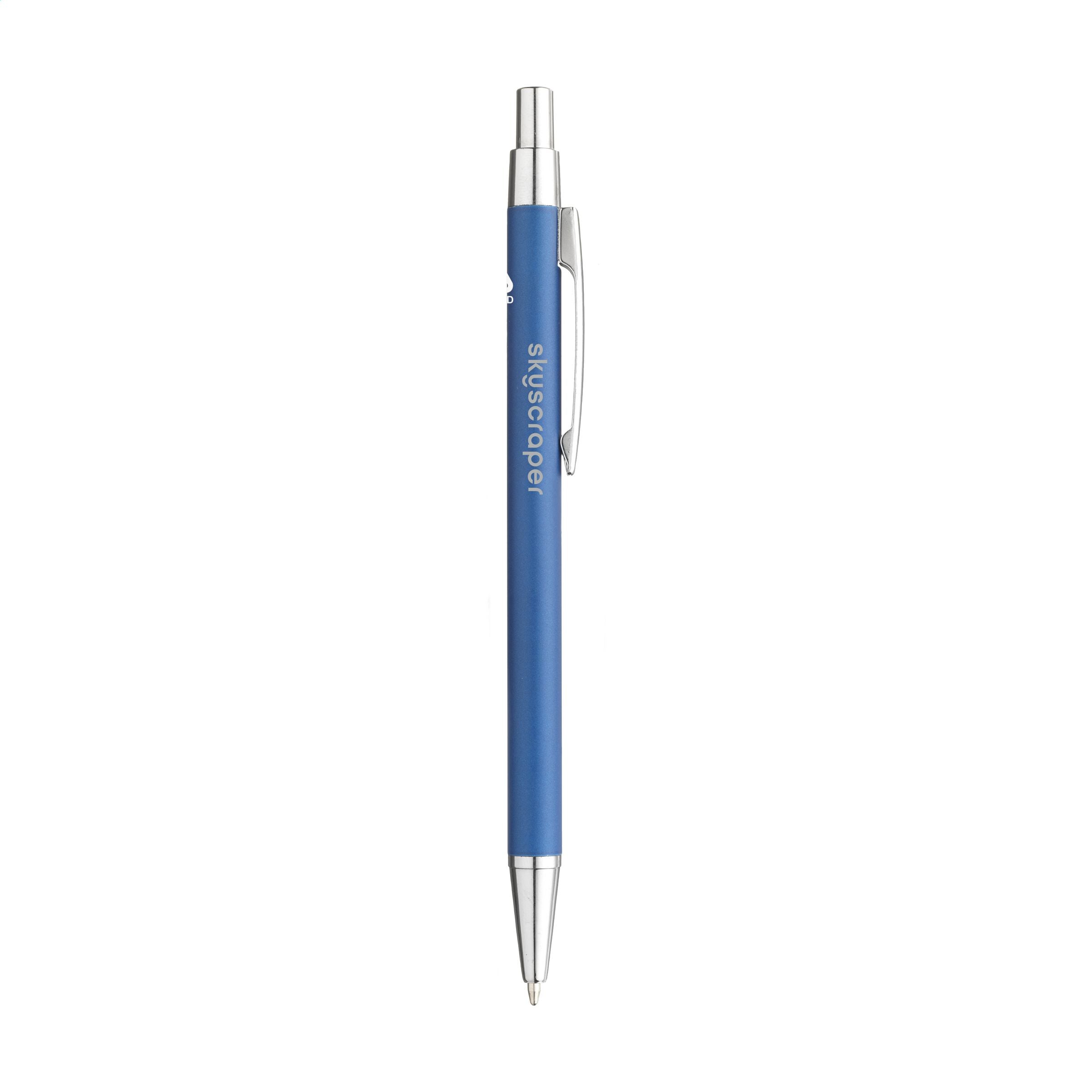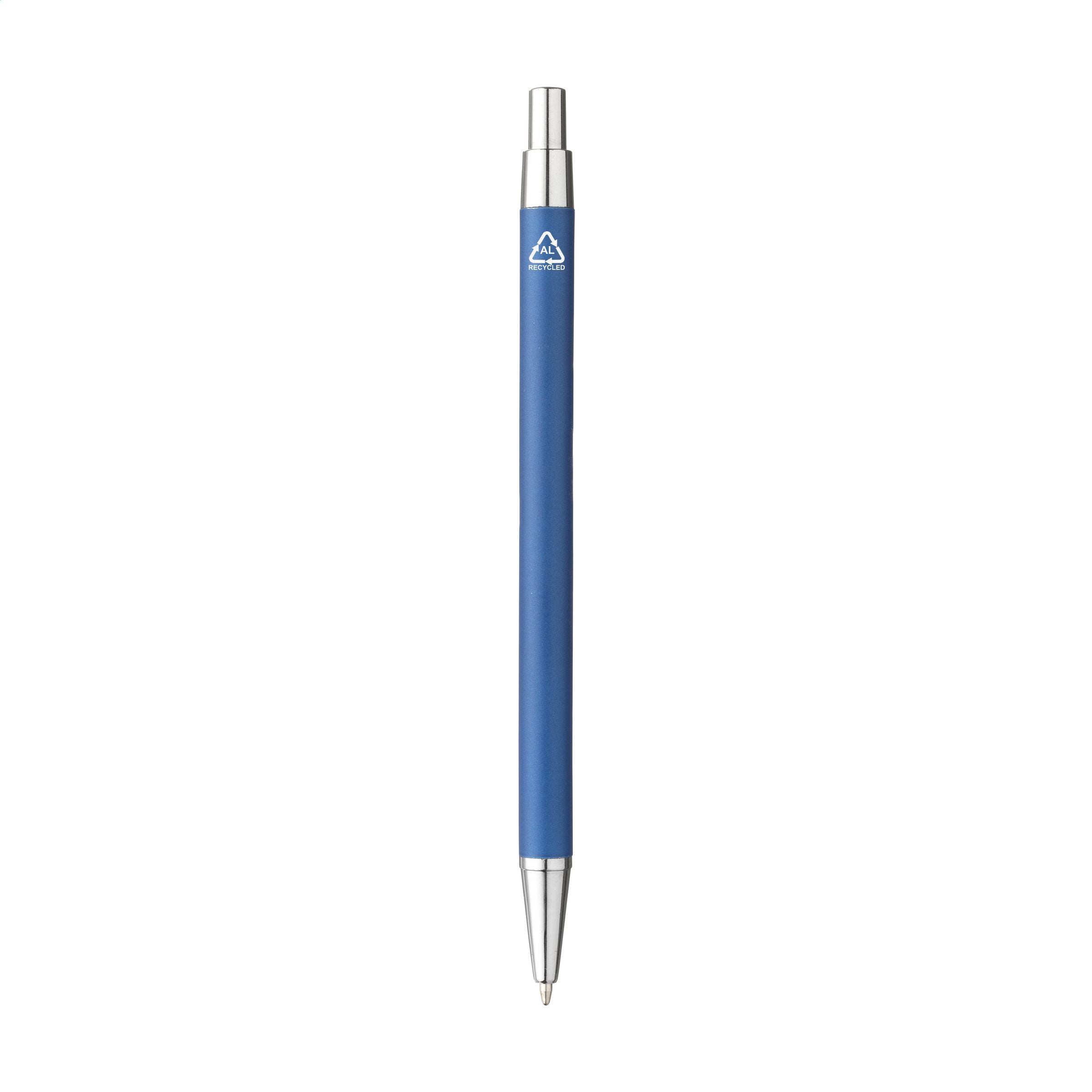 WoW! Blauschreibender Kugelschreiber mit schlankem Halter aus Aluminiumschrott. Der Halter dieses Kugelschreibers besteht zu 85% aus zertifiziertem, recyceltem Aluminium. Mit stabilem Metallclip und Druckknopf. Durch die Verwendung von recyceltem Aluminium werden bei der Herstellung dieses Produkts weniger neue Rohstoffe verwendet. Das bedeutet weniger Energieverbrauch und weniger Wasserverbrauch.